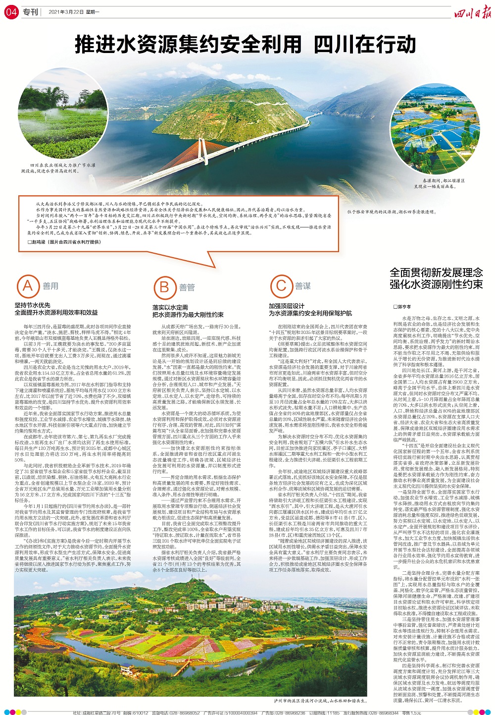 四是坚持科学调水。制订和完善水资源调度方案和调度计划,充分发挥沱江等三大流域水资源调度联席会议协调机制作用,确保区域水资源及水力发电、航运等调度均服从流域水资源统一调度。加强水资源调度管控断面监测、预警和处置,不断提高河湖生态流量,确保长江、黄河一江东流。