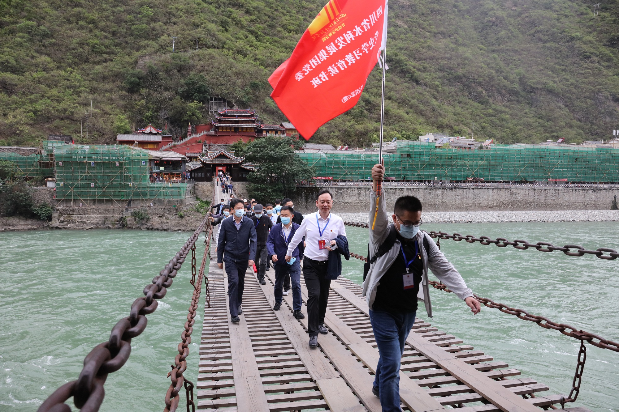 16:00,大家高举着党旗,重走当年红军冲锋过的泸定桥。现在的泸定桥因加固措施,远远不及当年的天险,但大渡河湍急的河流,泸定桥摇晃的铁索,还是让大家感受到了它的惊险。同志们回顾当年二十二位勇士在昼夜兼程一百二十公里的路程后,在身体极度疲乏的情况下,匍匐前行在十三根光溜溜被大火烤得炽热的铁索上,冒着敌军枪林弹雨,冲锋成功飞夺泸定桥的英雄事迹,无比崇敬、震撼的心情久久不能平静。