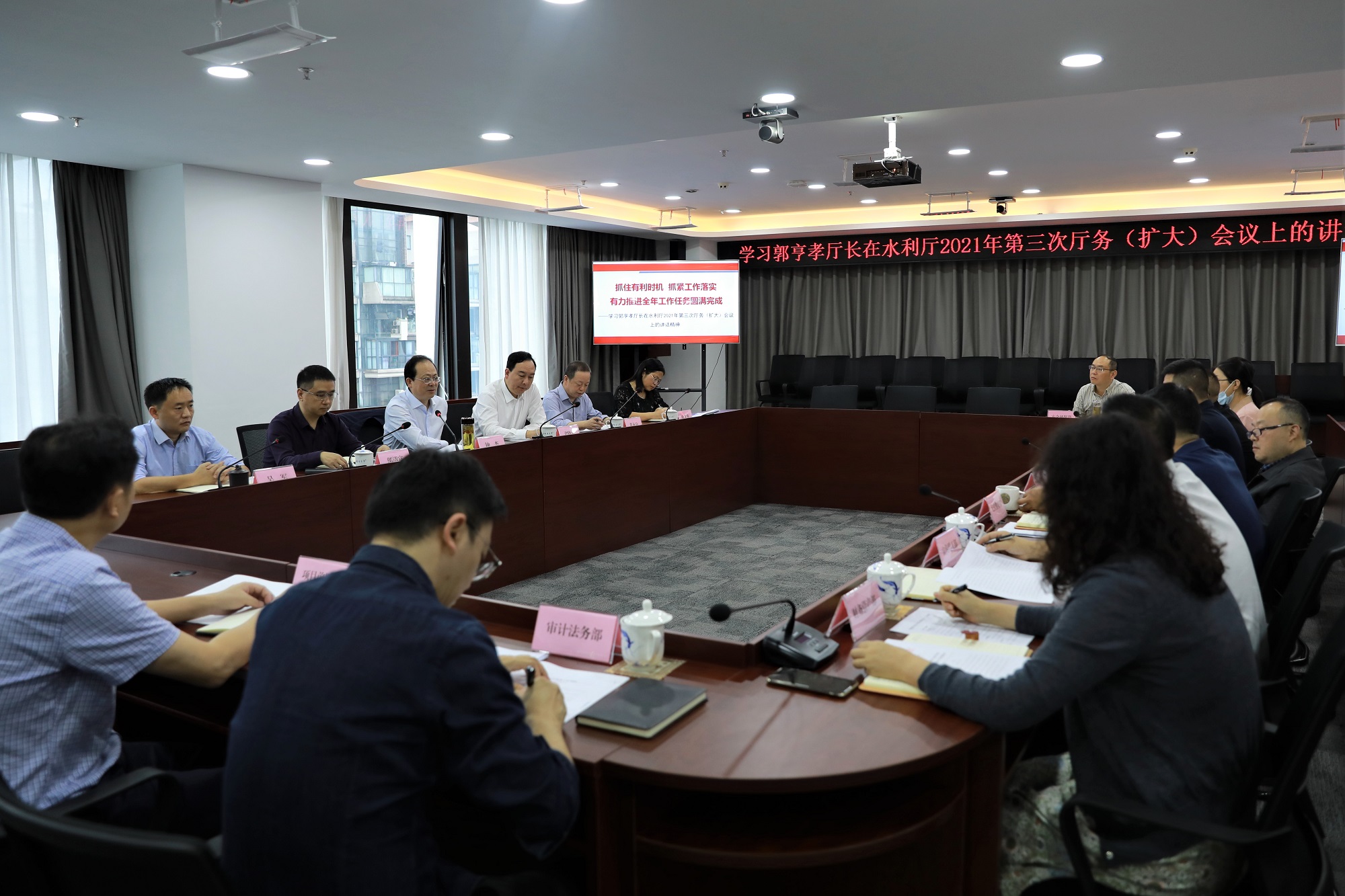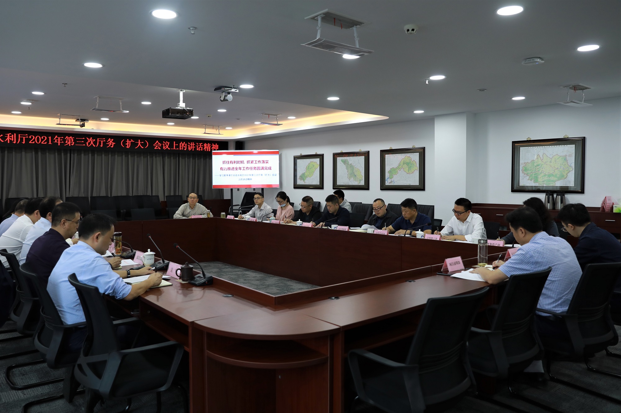 9月15日,水利厅召开2021年第三次厅务(扩大)会议,郭亨孝厅长以“抓住有利时机 抓紧工作落实 有力推进全年工作任务圆满完成”为主题,重点回顾了今年以来厅党组带领全厅以“组合拳”形式推进的十项工作,全面梳理了落实“3226”工作思路20个方面落实落细的具体工作思路和方法,同时对推动第四季度工作适度转段提出了要求。郭厅长的讲话多处提及水发集团,对集团当前和今后一个阶段的工作具有十分重要的指导意义。