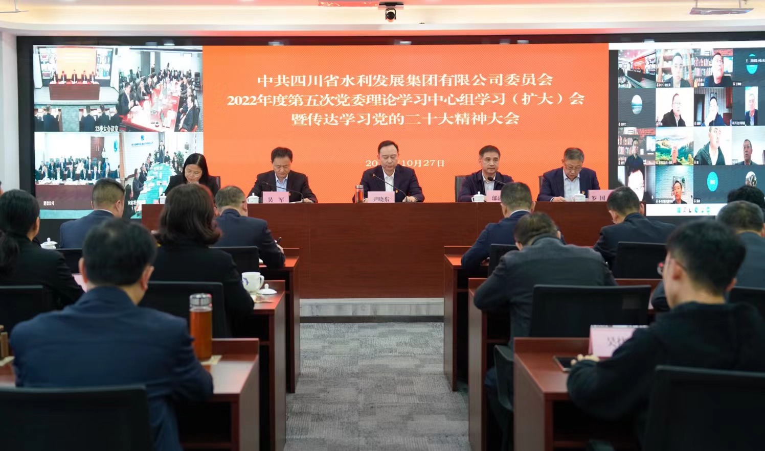 10月27日,集团召开2022年度第五次党委理论学习中心组(扩大)会议暨传达学习党的二十大精神大会,专题学习传达党的二十大报告精神、习近平总书记在参加党的二十大广西代表团讨论时的重要讲话精神、习近平总书记在党的二十大闭幕会上的重要讲话精神、习近平总书记在二十届中共中央政治局常委同中外记者见面时的重要讲话精神,关于十九届中央纪律检查委员会工作报告的决议、关于《中国共产党章程(修正案)》的决议,以及四川省传达学习党的二十大精神大会精神、水利厅传达学习党的二十大精神大会精神。集团党委副书记、董事、副总经理、总会计师尹晓东主持会议并对传达学习党的二十大精神进行了安排部署。会议集体观看了《习近平的二十大时间》学习视频,集团党委委员、纪委书记吴军领学了党的二十大报告原文。