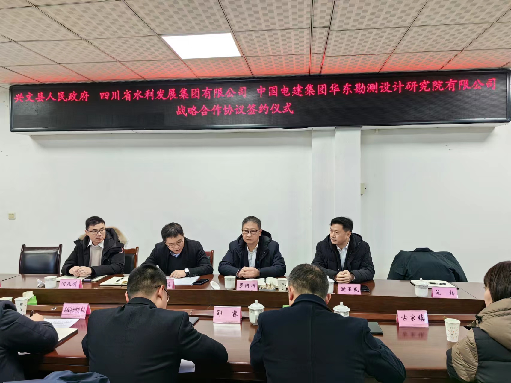 1月16日,集团与兴文县人民政府、中电建华东院战略合作签约仪式在兴文县人民政府三楼会议室举行。集团董事罗国书、兴文县人民政府副县长邵睿、中国电建集团华东勘测设计研究院有限公司西南区域总部总经理张发鸿出席仪式。