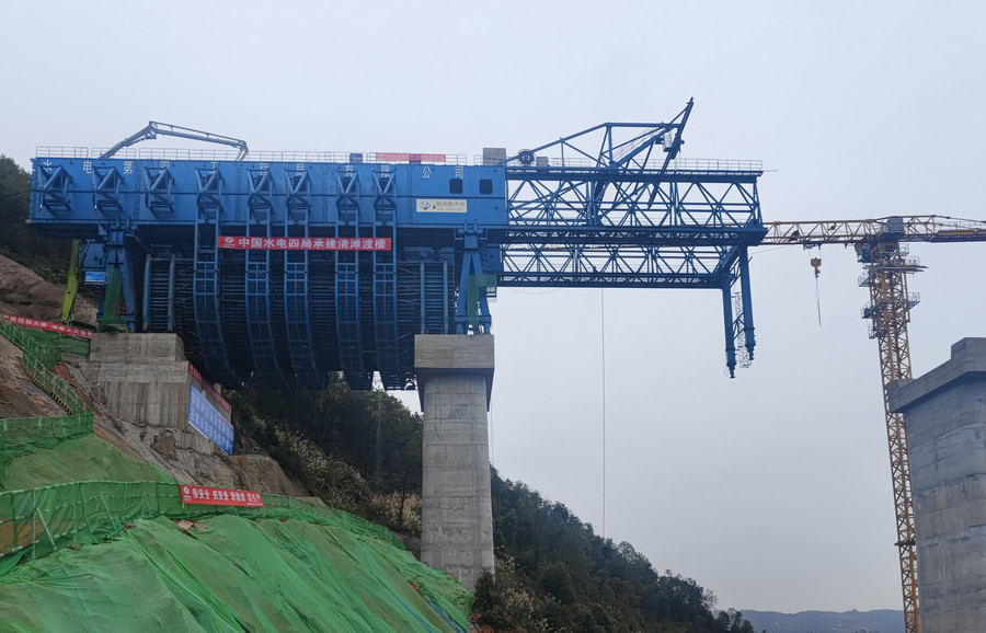 12月17日,清滩渡槽首跨浇筑成功。清滩渡槽坐落于宜宾市翠屏区金坪镇,位于向家坝灌区北总干渠一期一步工程的关键线路上。清滩渡槽工程全长290米,进口段长40米、槽身段长230米、出口段长20米。渡槽上部结构为预应力混凝土U型简支梁,槽内设计水深为5.83米,设计流量84m3/s。清滩渡槽前紧接一步滩隧洞,后紧随大岩上隧洞,横跨黄沙河、内六铁路和天然气管道,增加了施工难度及风险。