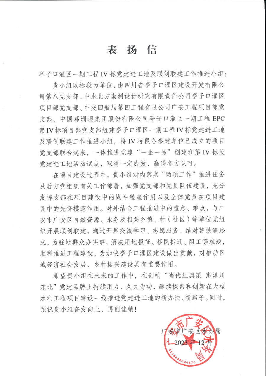 近日,亭子口灌区一期工程第Ⅳ标“党建进工地”及联创联建工作推进小组收到广安市广安区水务局发来的表扬信,对企地共建取得的成效表示肯定。这是“党建进工地”深化党建引领重大工程建设,充分发挥参建单位党组织引领作用,凝聚工作合力,破解工程建设难点难题,推动工程有序实施的具体体现。