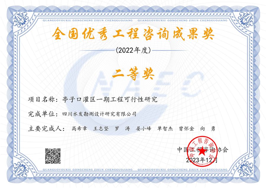 2023年12月29日,在中国工程咨询协会发布的《中国工程咨询协会关于公布2022年度全国优秀工程咨询成果奖获奖项目名单的通知》(中咨协政研(2023)112号)中,四川水发设计公司完成的《亭子口灌区一期可行性研究》荣获全国优秀工程咨询成果二等奖。