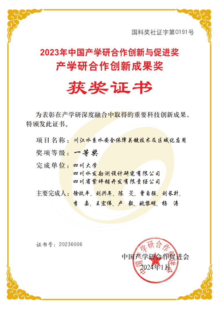 近日,由中国产学研合作促进会主办的第十五届中国产学研合作创新大会在北京隆重举行。会议对2023年在产学研深度融合等方面作出贡献的先进单位和个人进行了颁奖表彰,由四川水发设计公司联合四川大学、四川省紫坪铺开发有限责任公司完成的项目“川江水系水安全保障关键技术及区域化应用”荣获2023年产学研合作创新成果一等奖。这是该公司首次斩获该荣誉,也是其大力发展科技创新的重要成果,彰显了集团在水安全保障领域开展高质量产学研创新协同的创新成果。
