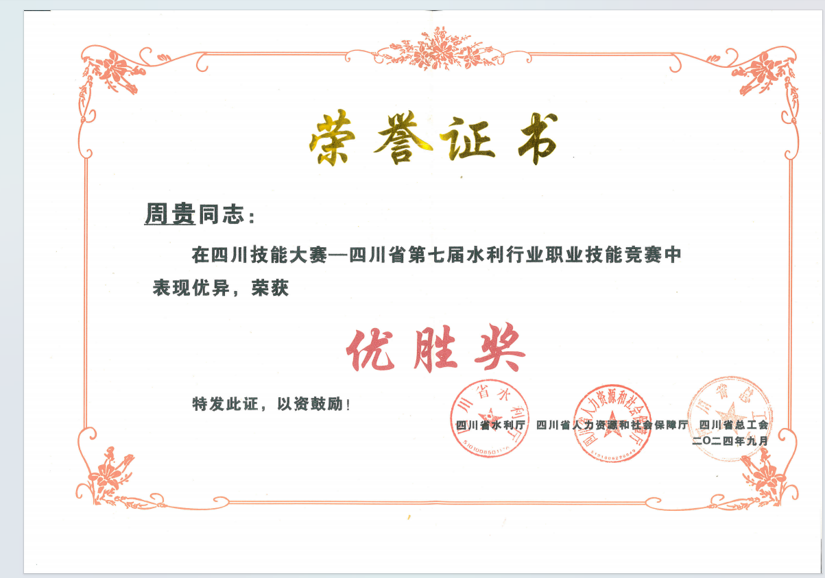 四川技能大赛——四川省第七届水利行业职业技能竞赛,由四川省水利厅、四川省人力资源和社会保障厅、四川省总工会联合举办,是四川省水利行业级别最高、规模最大、影响最广的职业技能赛事。本次竞赛分为理论考核和技能操作两部分进行,汇聚了全省水利行业从事水工闸门运行一线技能工作的37个单位82名参赛选手。经过预赛、决赛两个阶段的激烈角逐,集团组织参赛选手向家坝公司周贵在本次竞赛中喜获优胜奖。