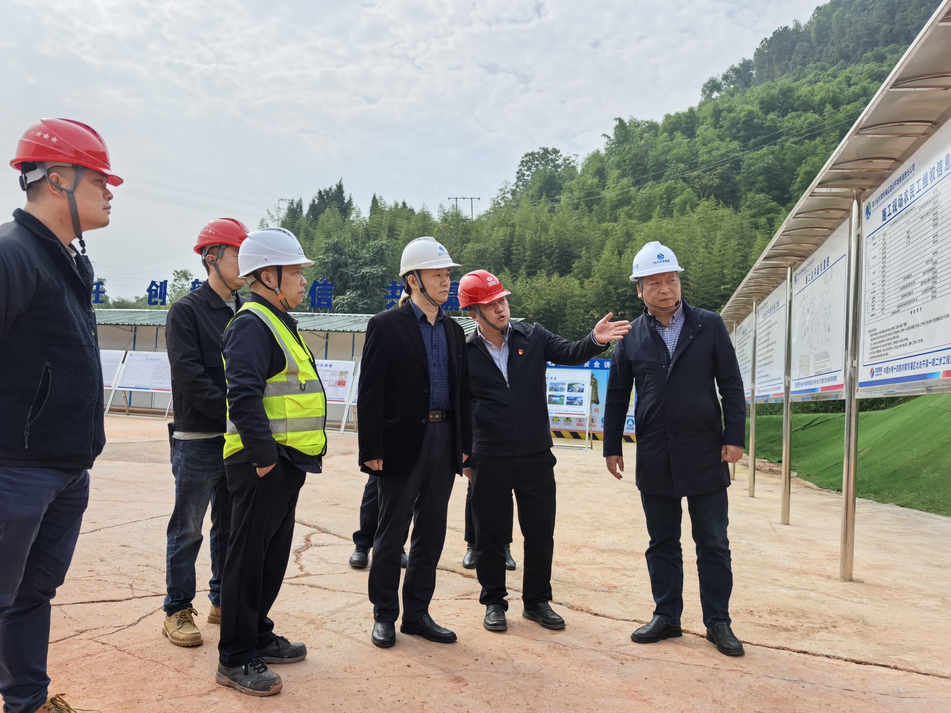 调研期间,吴军一行首先前往了向家坝灌区北总干渠一期一步猫儿沱江底隧洞出口,实地查看了隧洞第一阶段充水试验的进展情况,并详细询问了信息化系统的安装调试工作细节。随后,调研组前往向家坝灌区北总干渠一期二步工程施工第Ⅲ标段项目部的观音堂隧洞施工现场,深入了解当前的建设进度、安全生产措施落实情况以及党员活动阵地的建设成果。